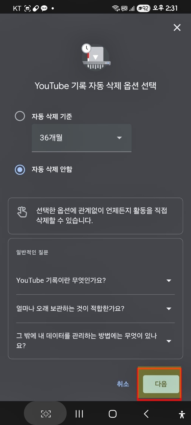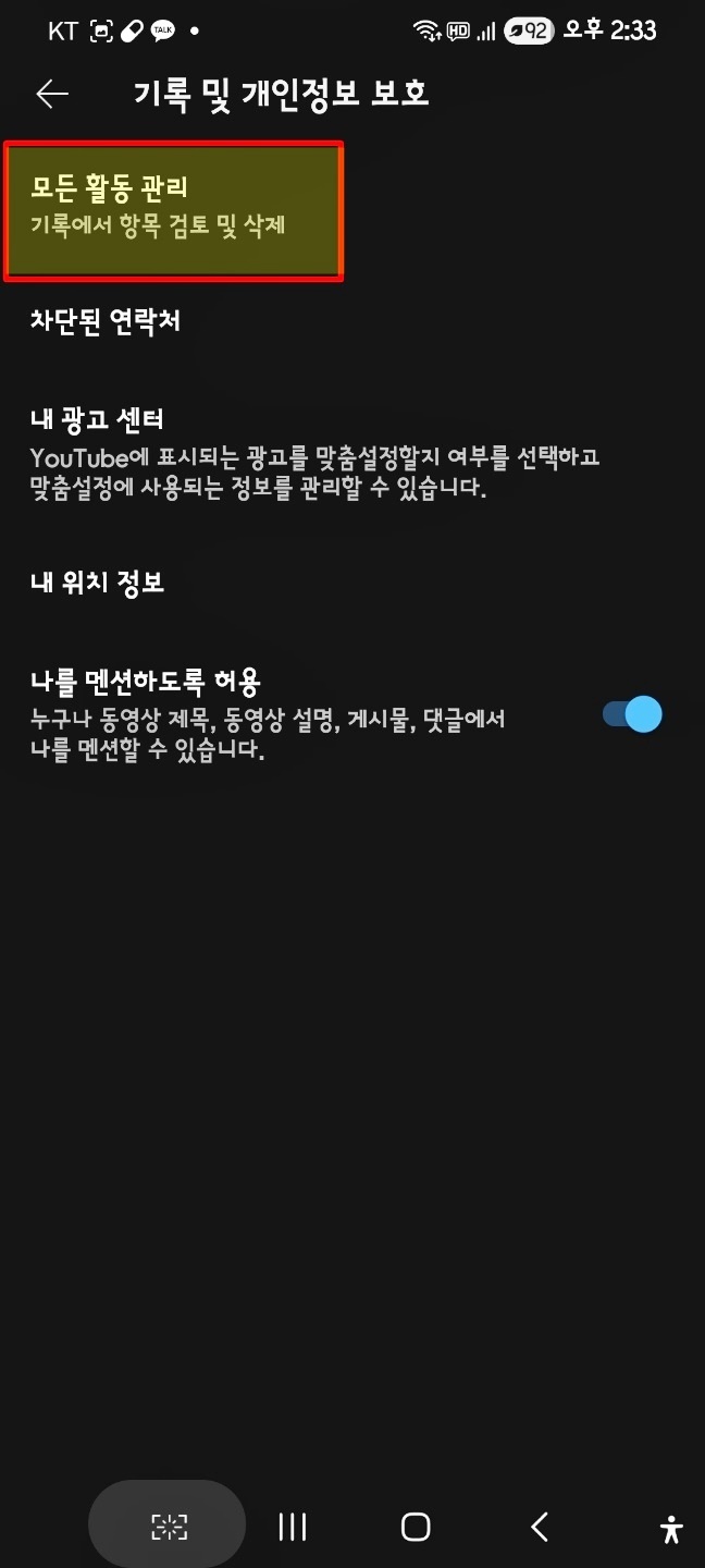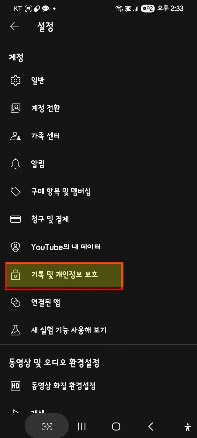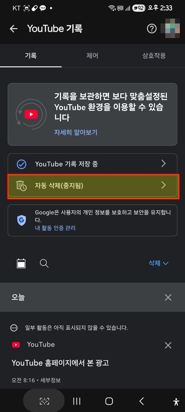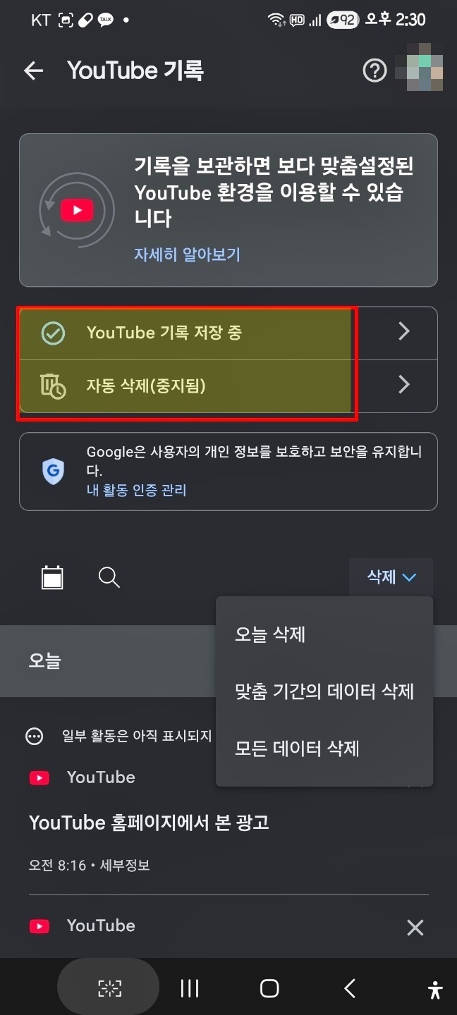유튜브 기록 사용중지를 눌러줘