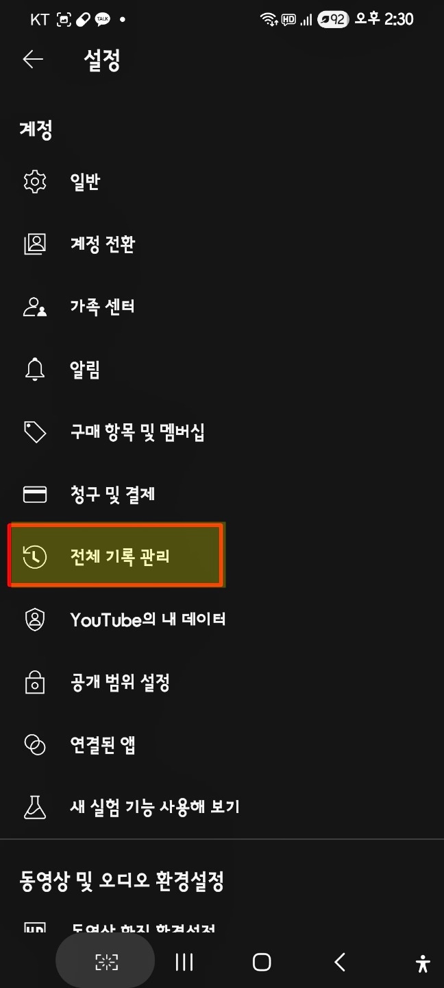 설정 화면이 보이면 전체 기록 관리를 찾아줘