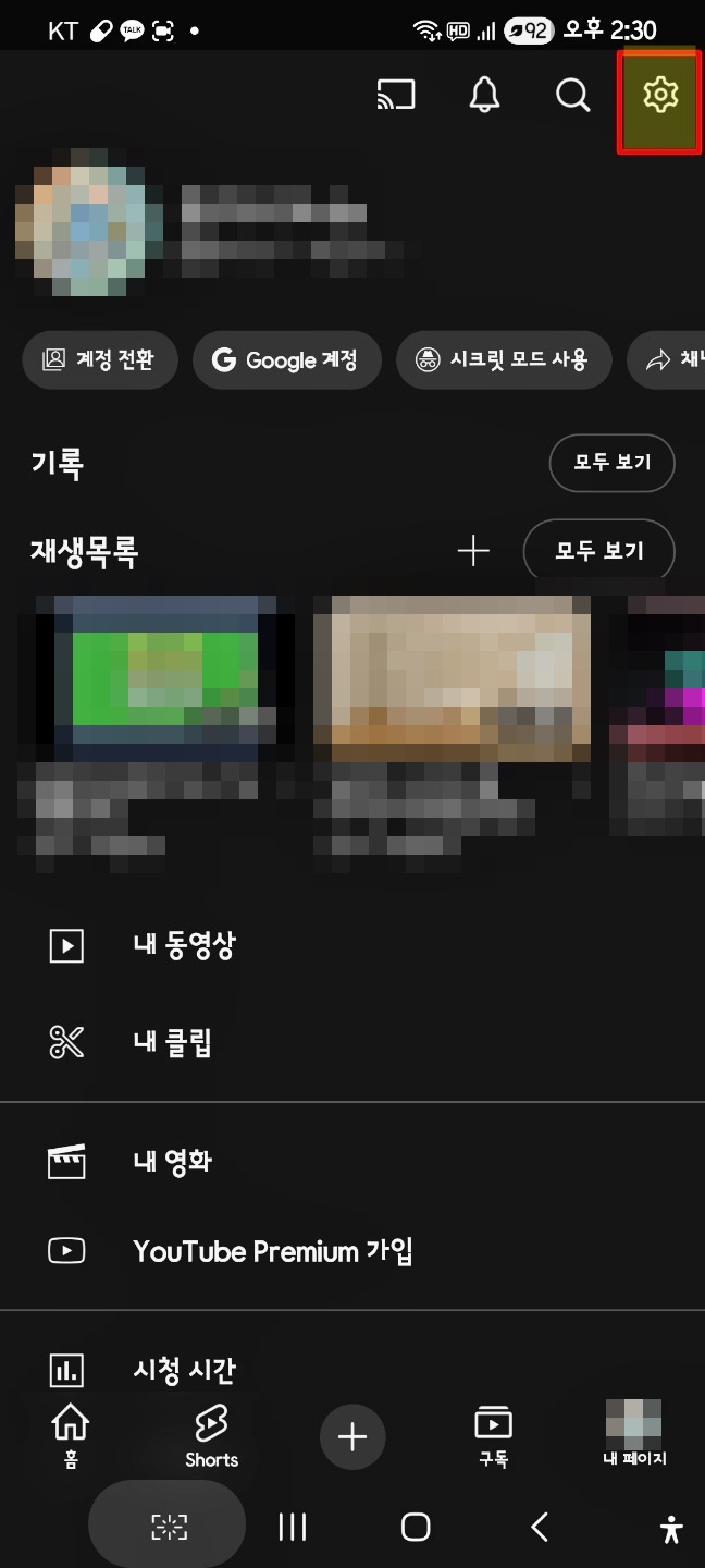 유튜브앱을 실행하고 내 페이지로 이동해 줘