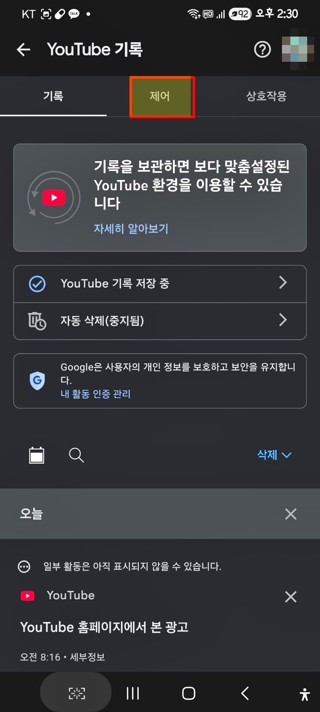 유튜브 기록 화면에서 제어를 선택해 줘