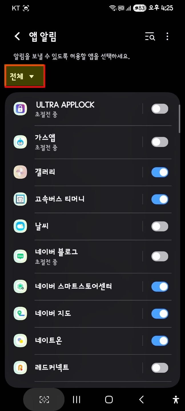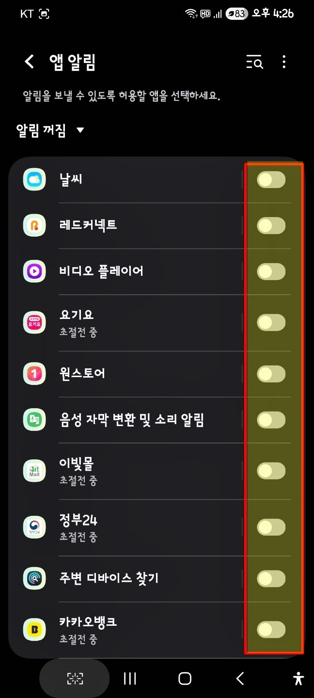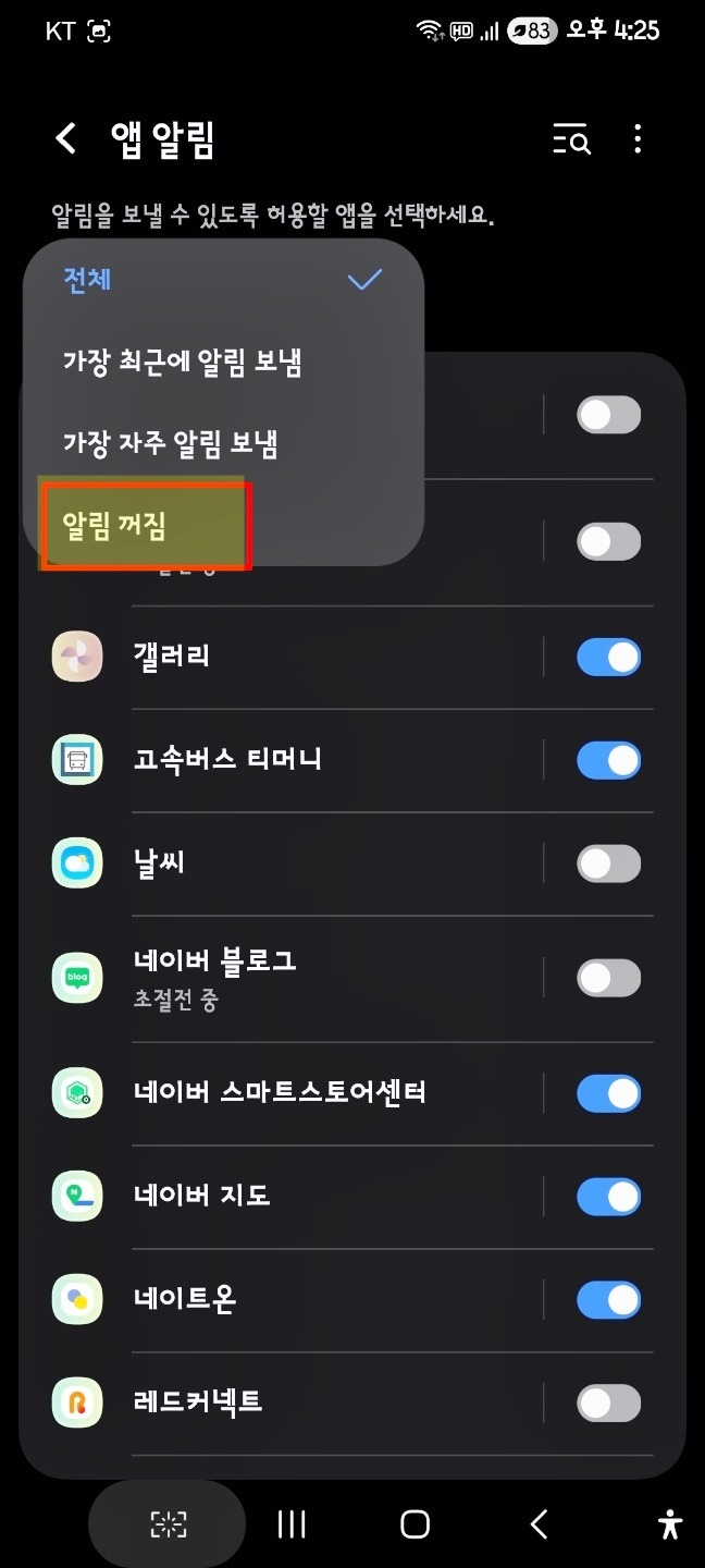 전체 버튼을 눌러서 알림 꺼짐을 선택해 줘