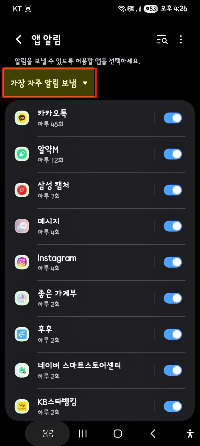 가장 자주 알림 보냄, 가장 최근에 알림 보냄 등도 확인해 줘