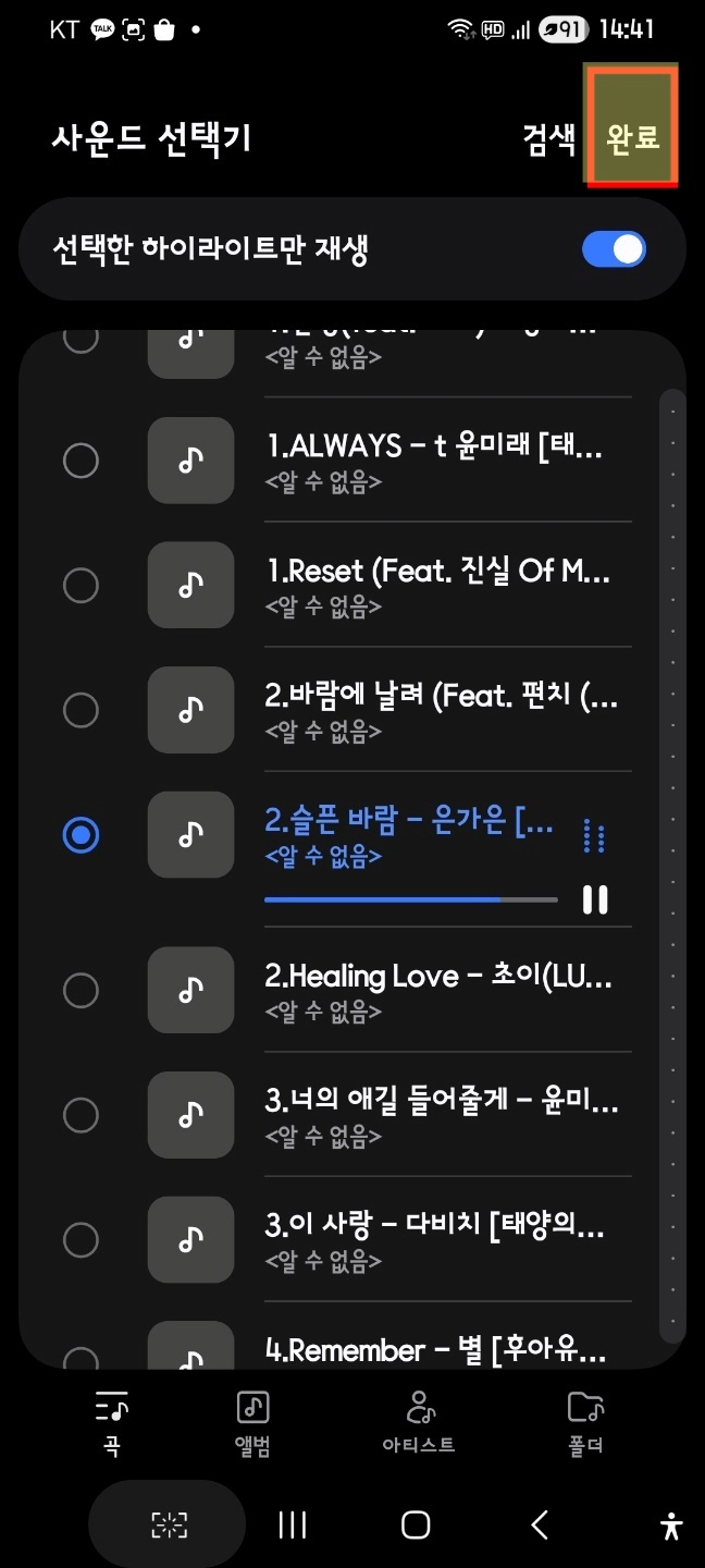 변경할 노래를 선택하고 완료 버튼을 누르면