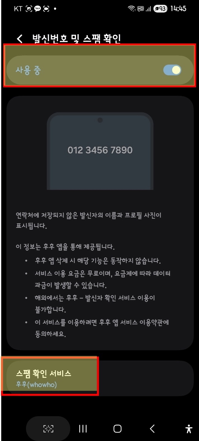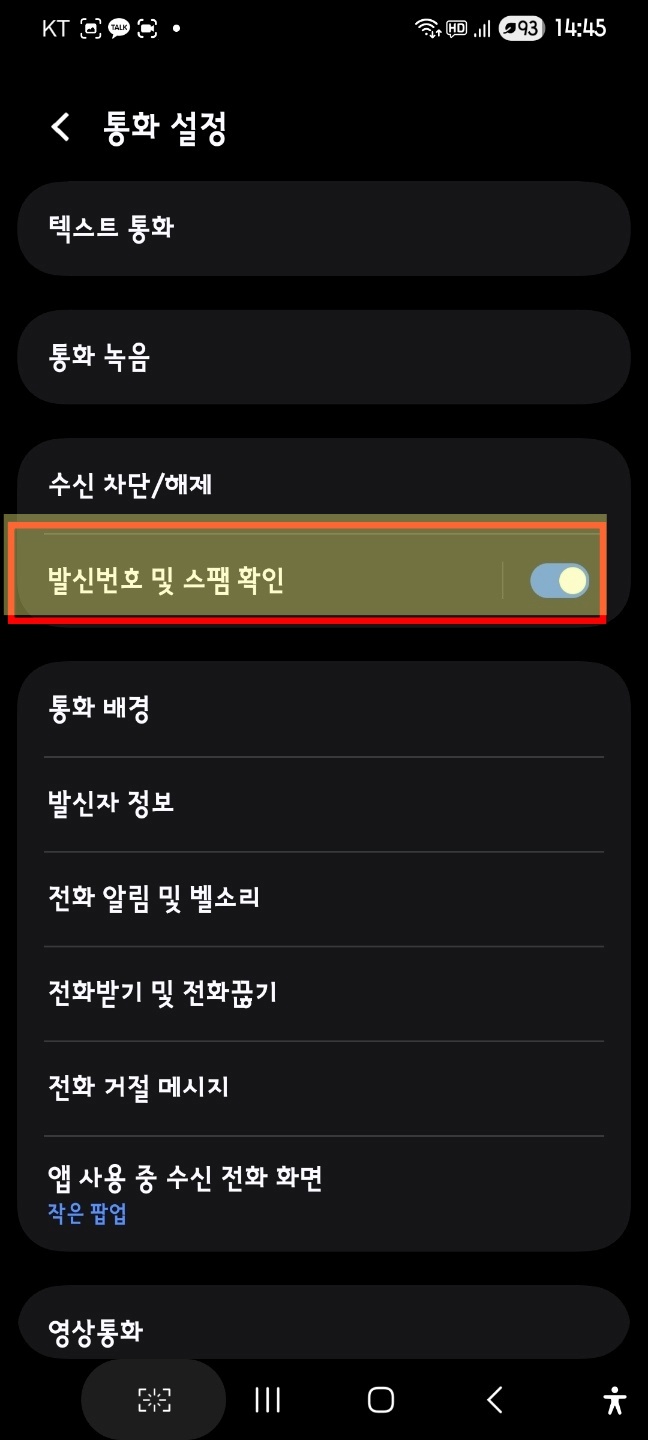 발신번호 및 스팸 확인을 눌러서 사용 중으로 변경해 줘