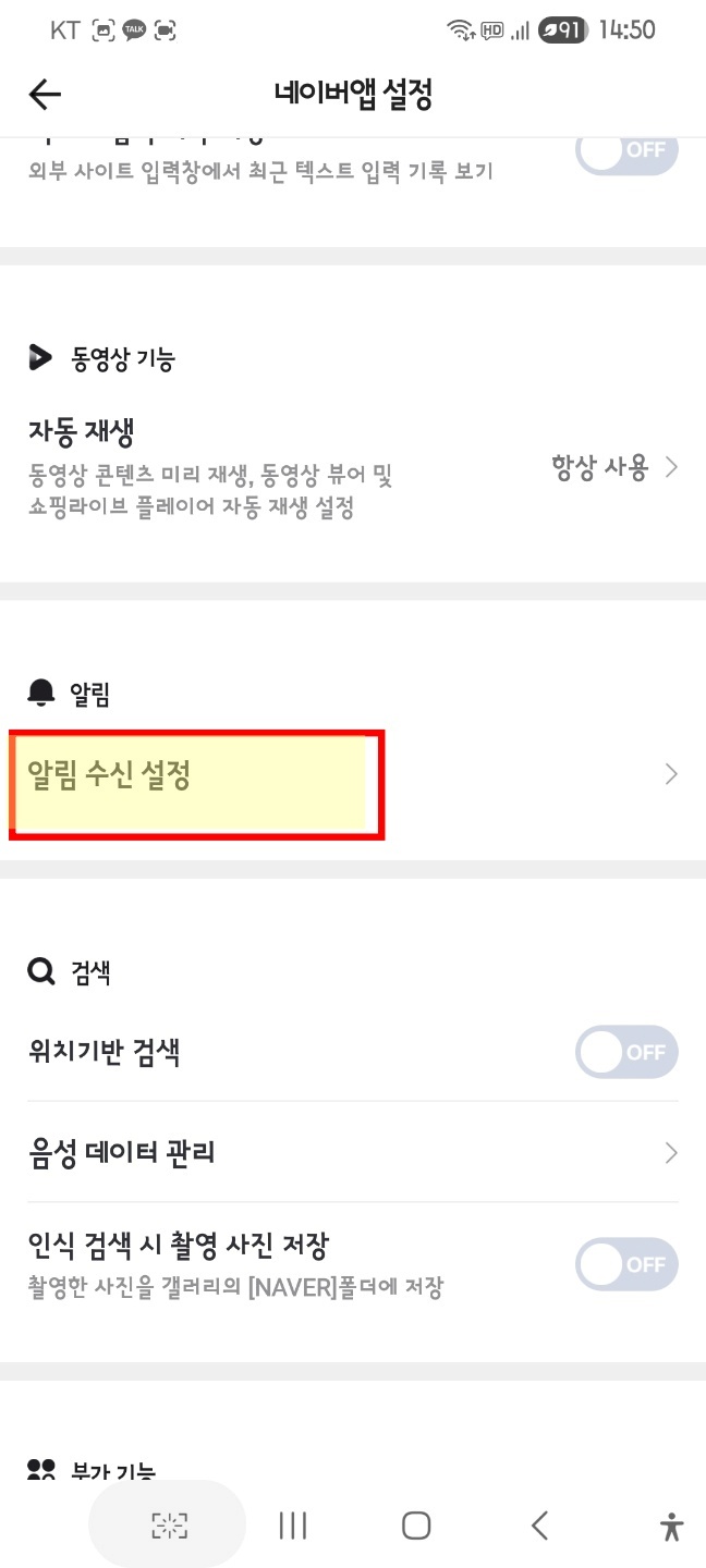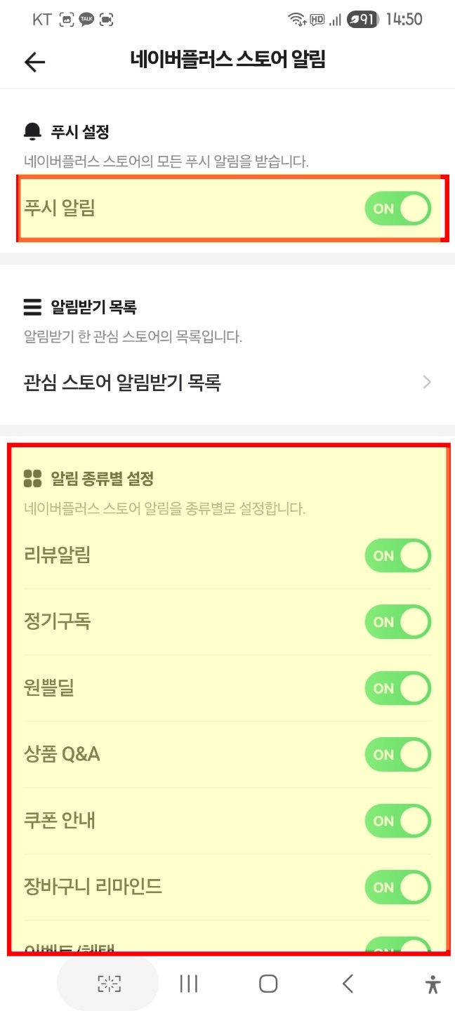 알림 항목의 알림 수신 설정을 통해 네이버플러스 스토어를 찾아줘