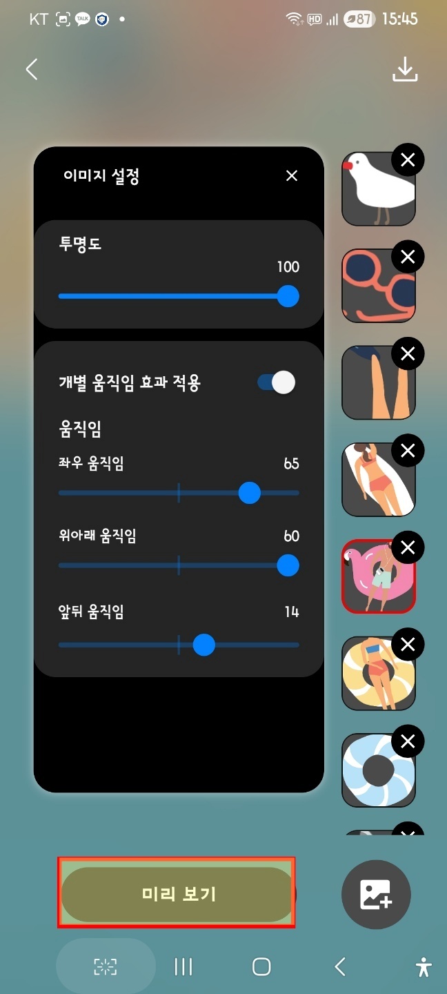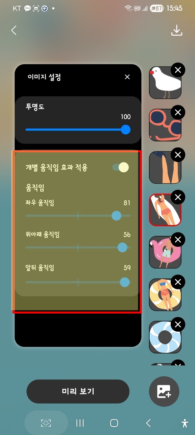 이미지 설정을 통해 투명도, 움직임 등 변경하고