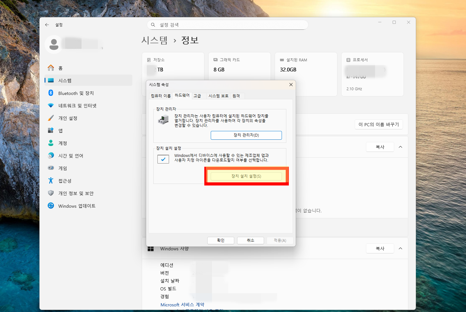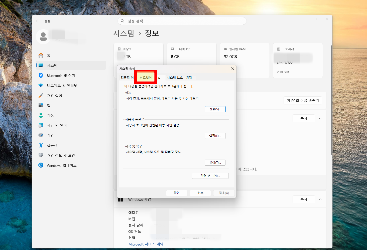 고급 시스템 설정을 선택하고 속성창이 보이면 하드웨어를 선택해 줘