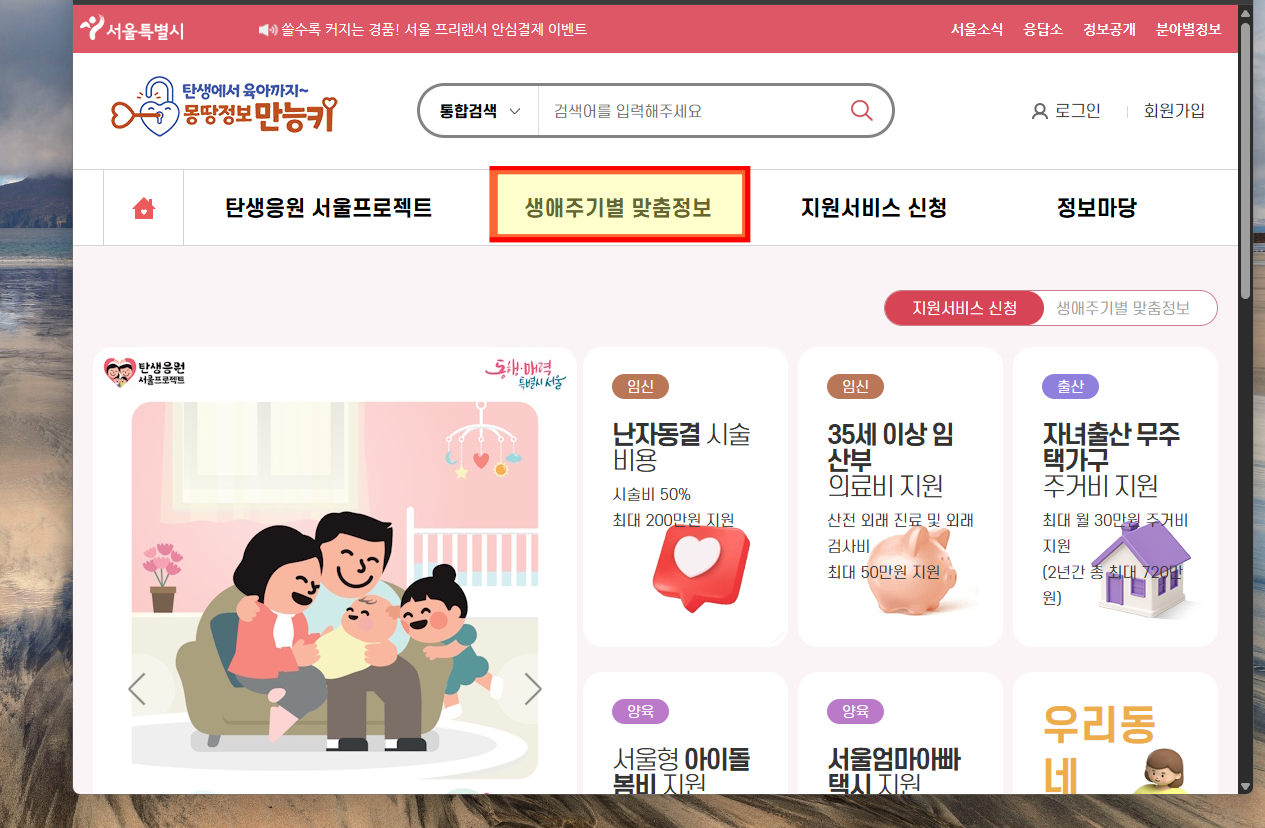 하나하나 살펴보기 어려울 수 있으니 생애주기별 맞춤정보를 선택해 줘