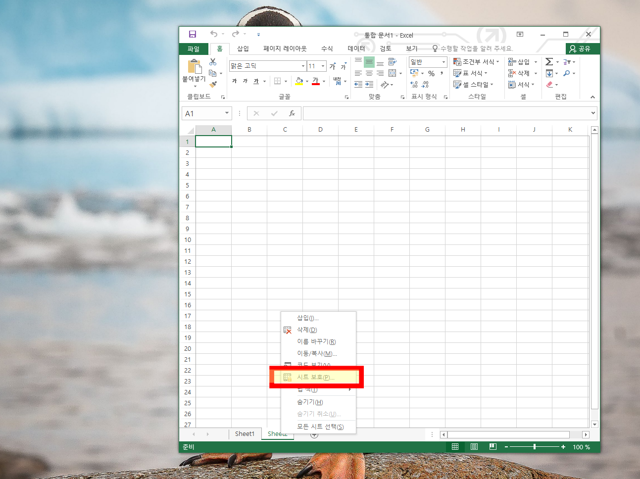 엑셀을 실행하고 보호하고 싶은 시트를 선택해 줘