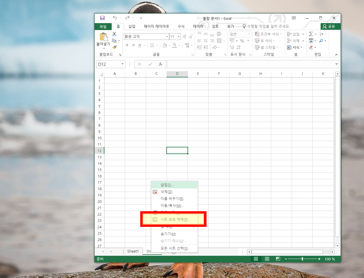 보호된 시트라면 마우스 우클릭하면 시트 보호 해제라고 보여
