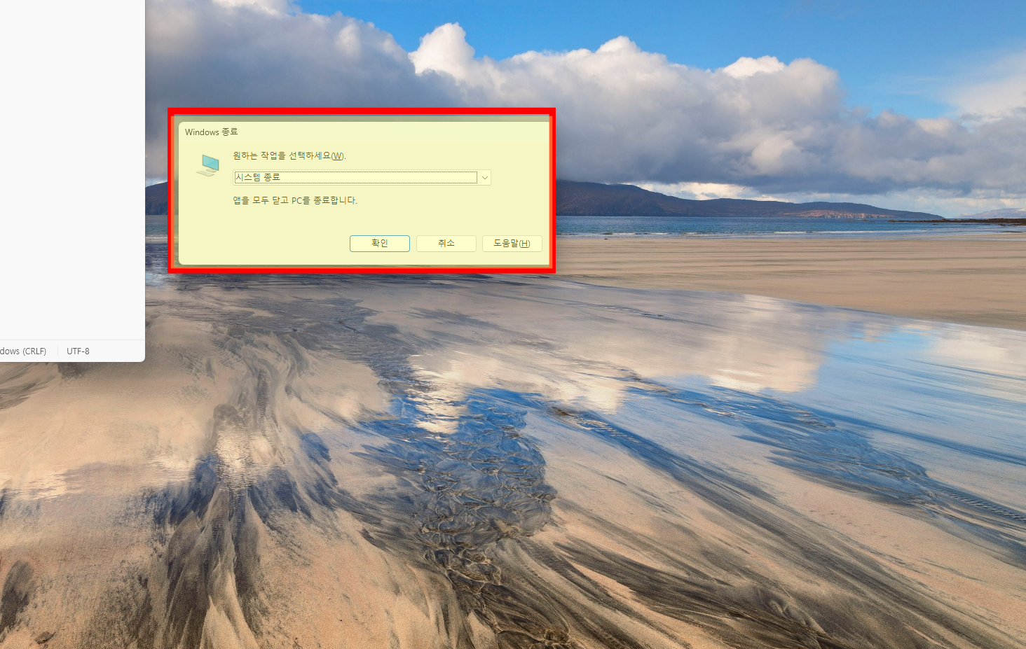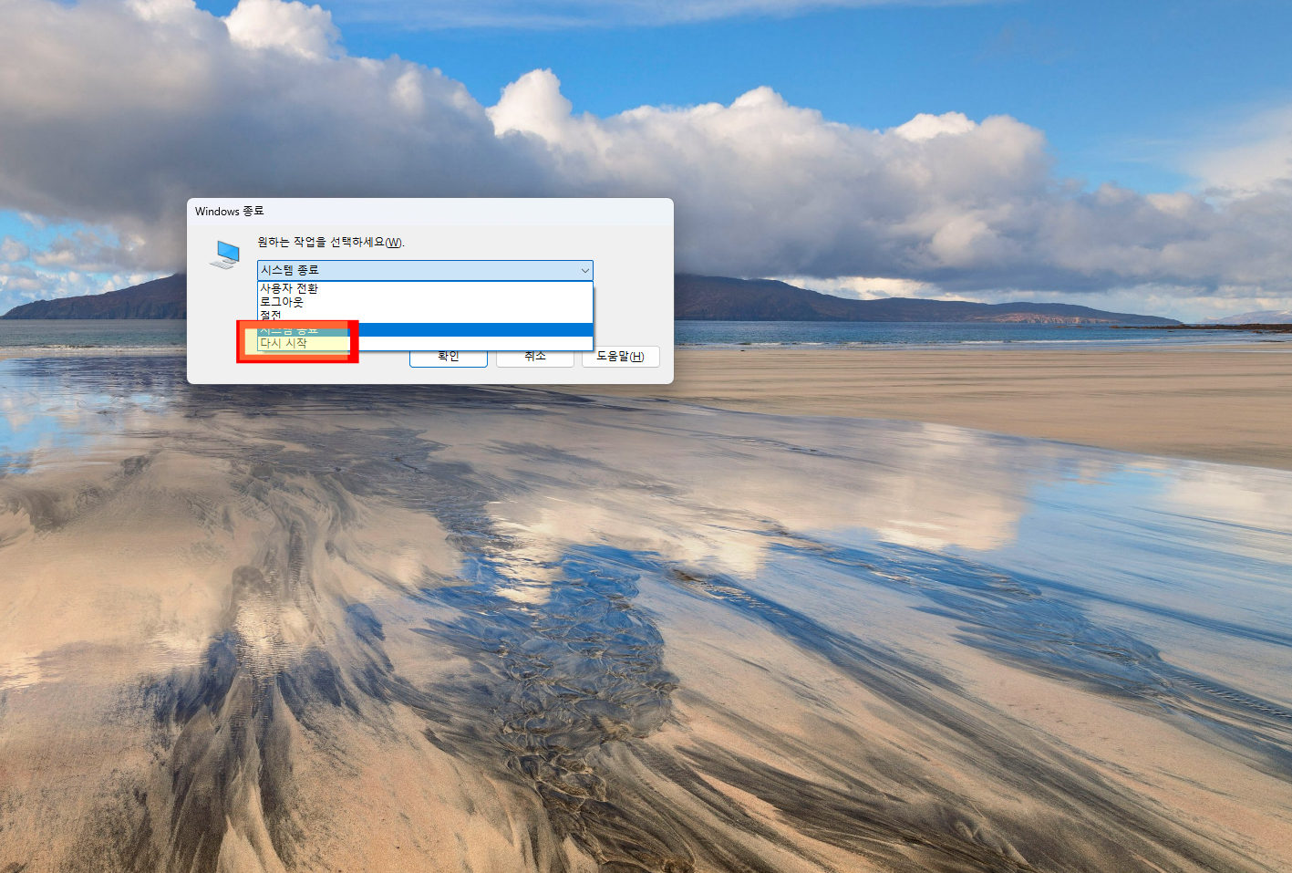 또는 Ctrl + Alt + Delete를 통해 오른쪽 하단의 전원 버튼을 이용해 줘