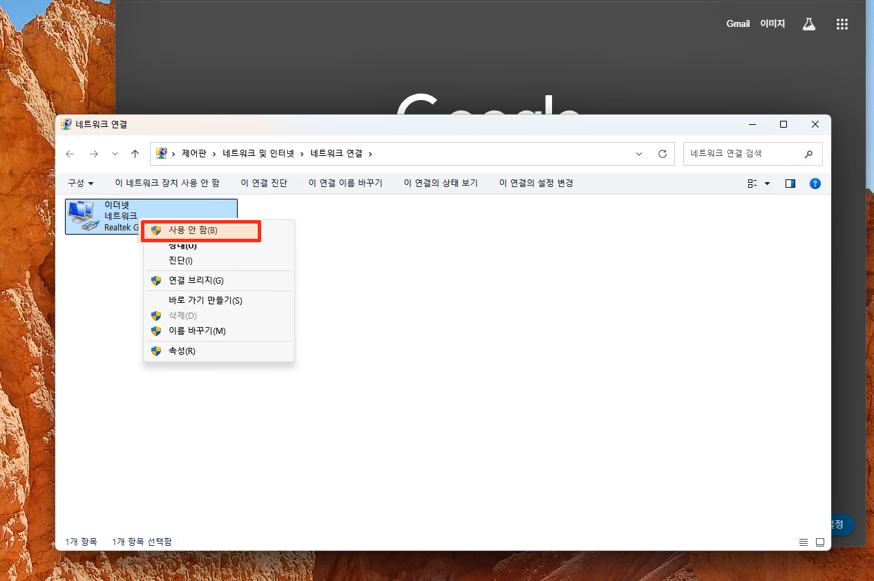 연결된 인터넷을 찾아 마우스 우클릭하고 사용 안 함을 선택해 줘