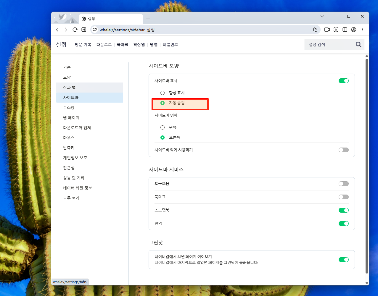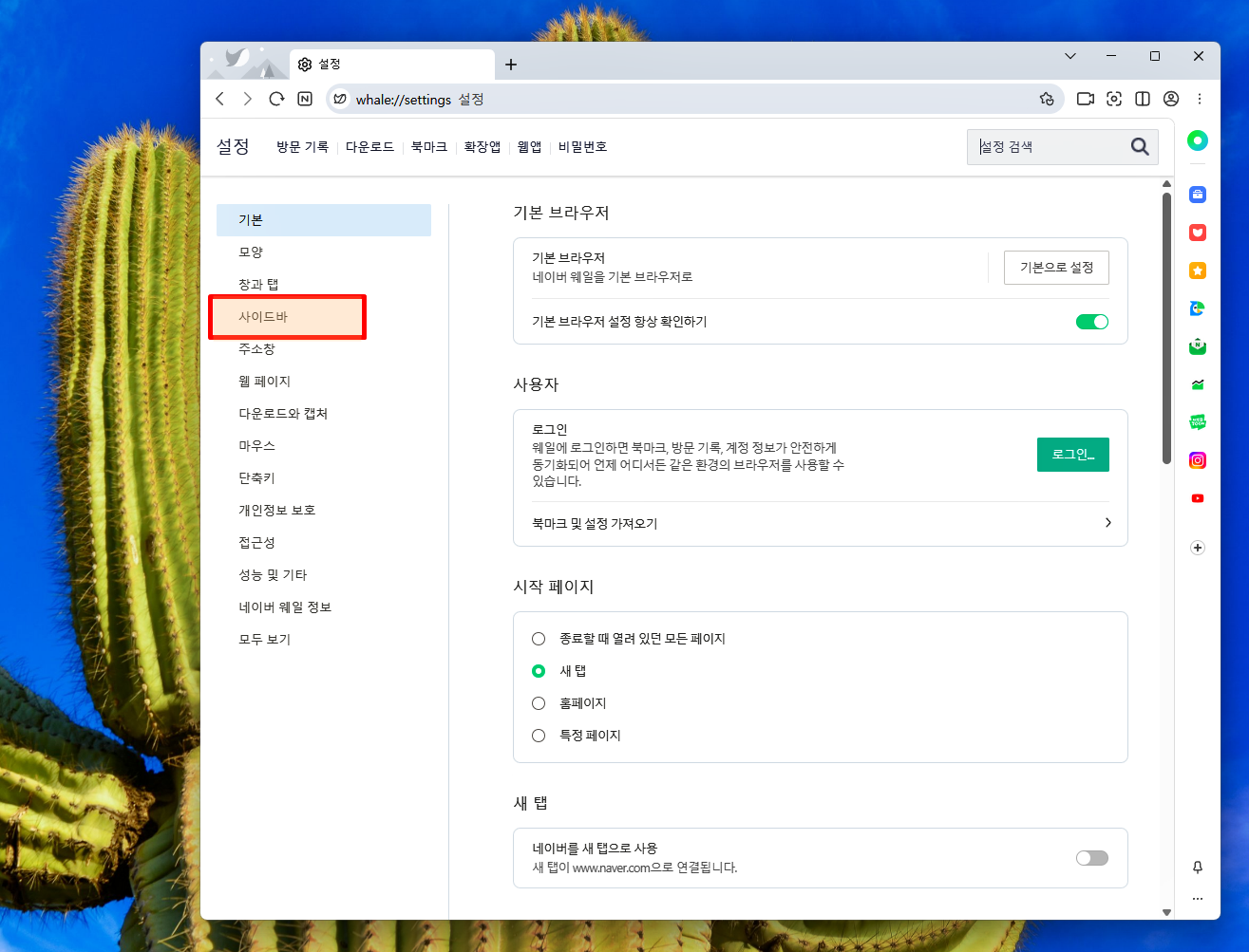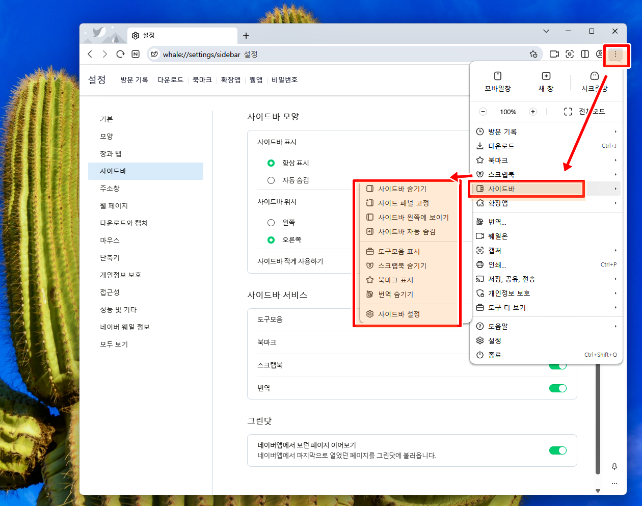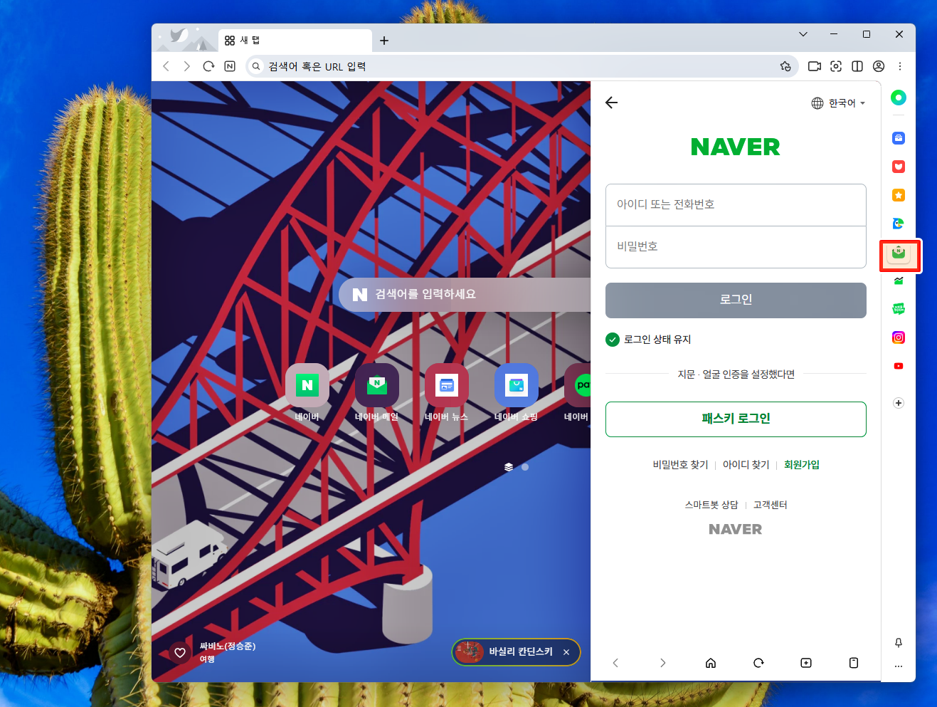 웨일을 실행하고 오른쪽에 사이드바를 확인할 수 있어