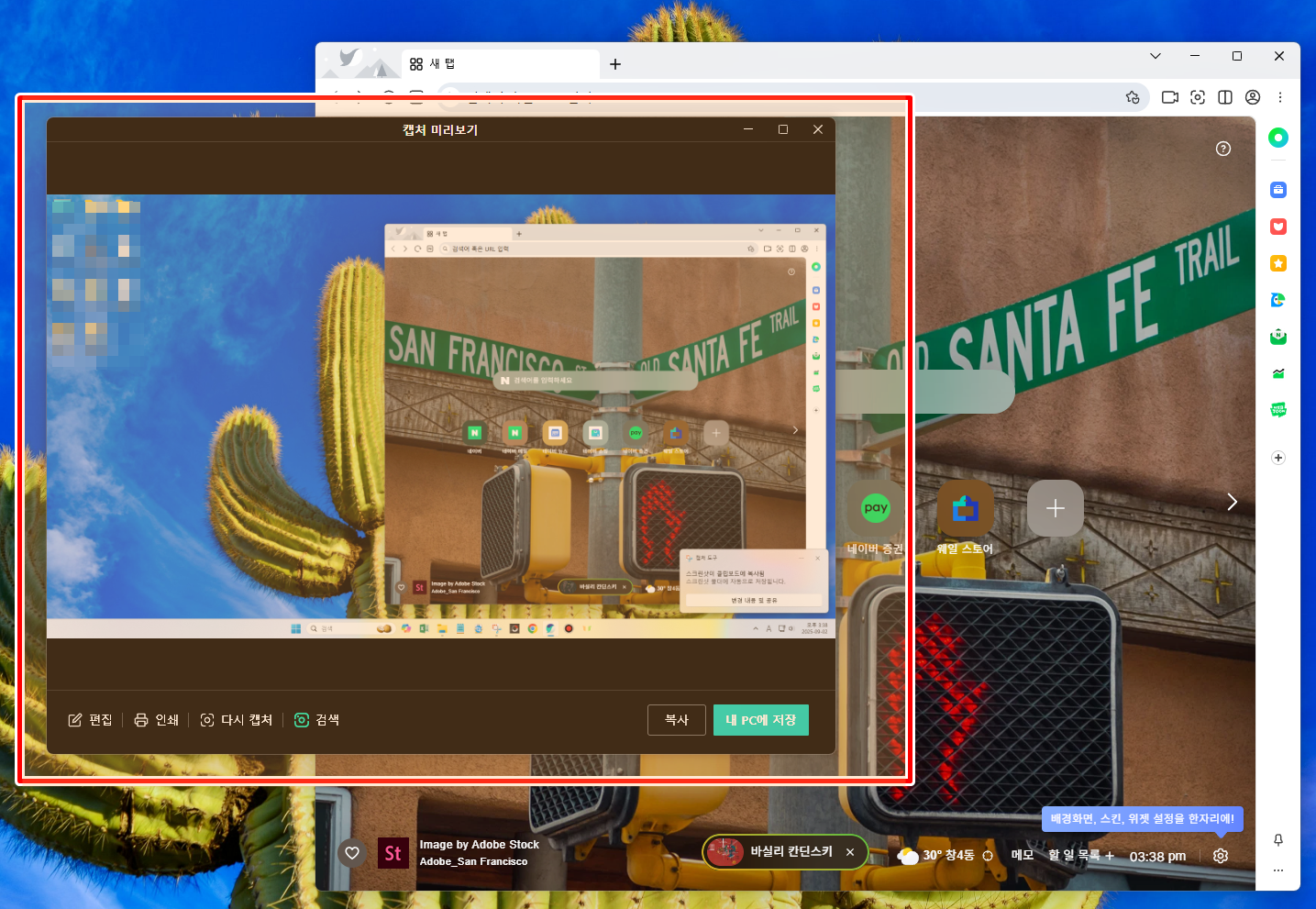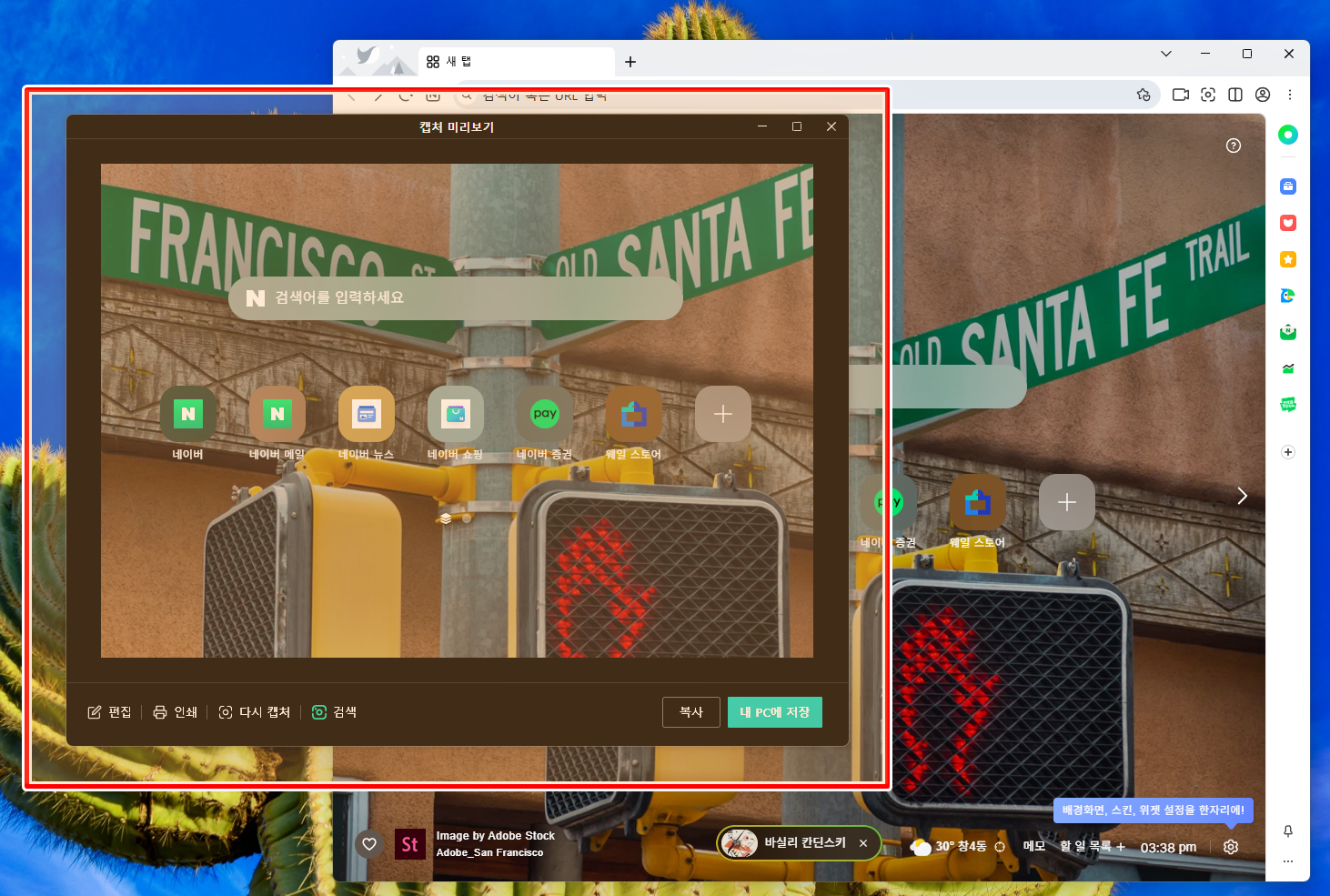 캡처에 있는 직접 지정, 영역 선택, 전체 페이지, 전체 화면을 누르고,