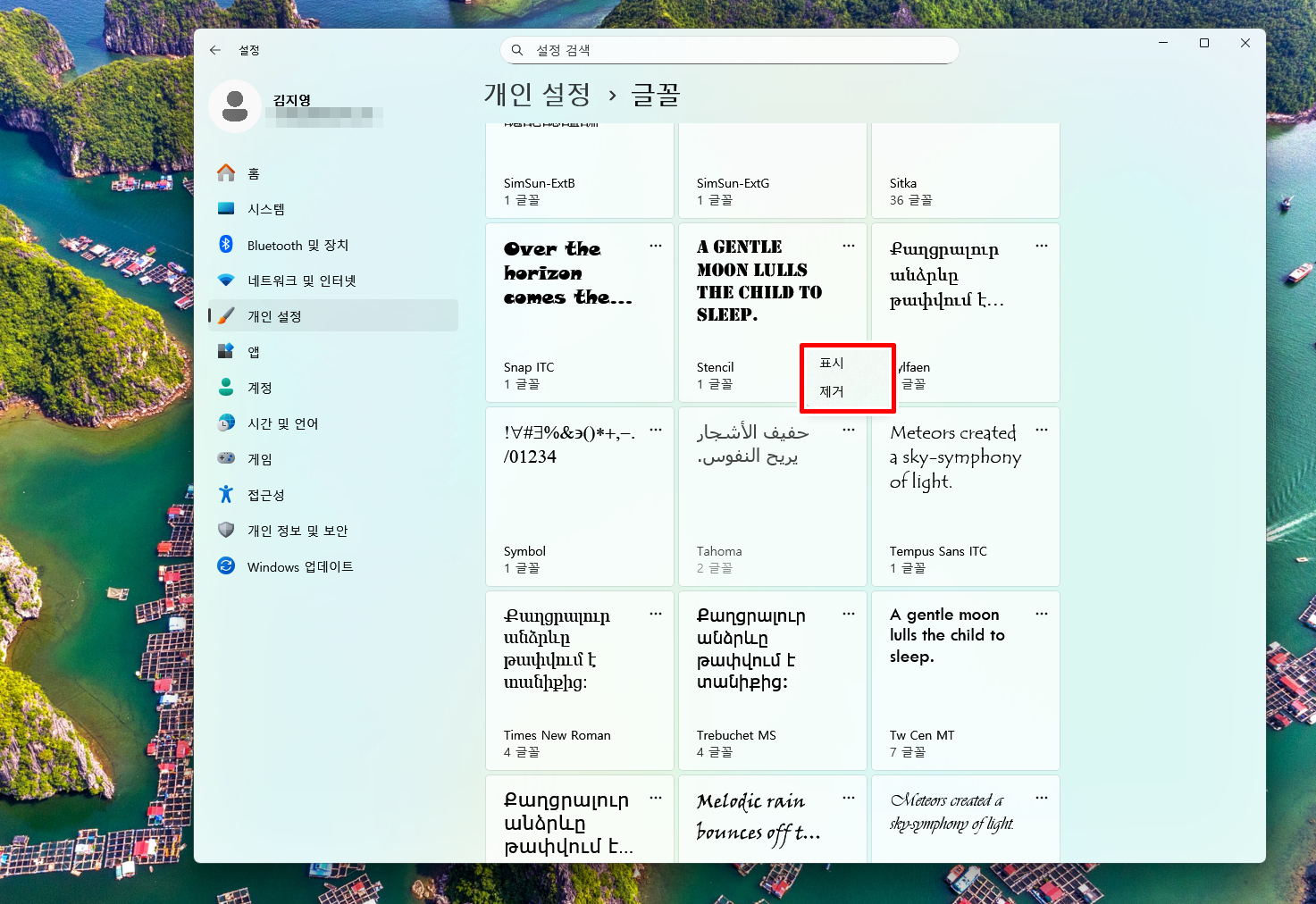 숨기기한 글꼴을 다시 표시할 수 있으니 필요에 따라 활용해
