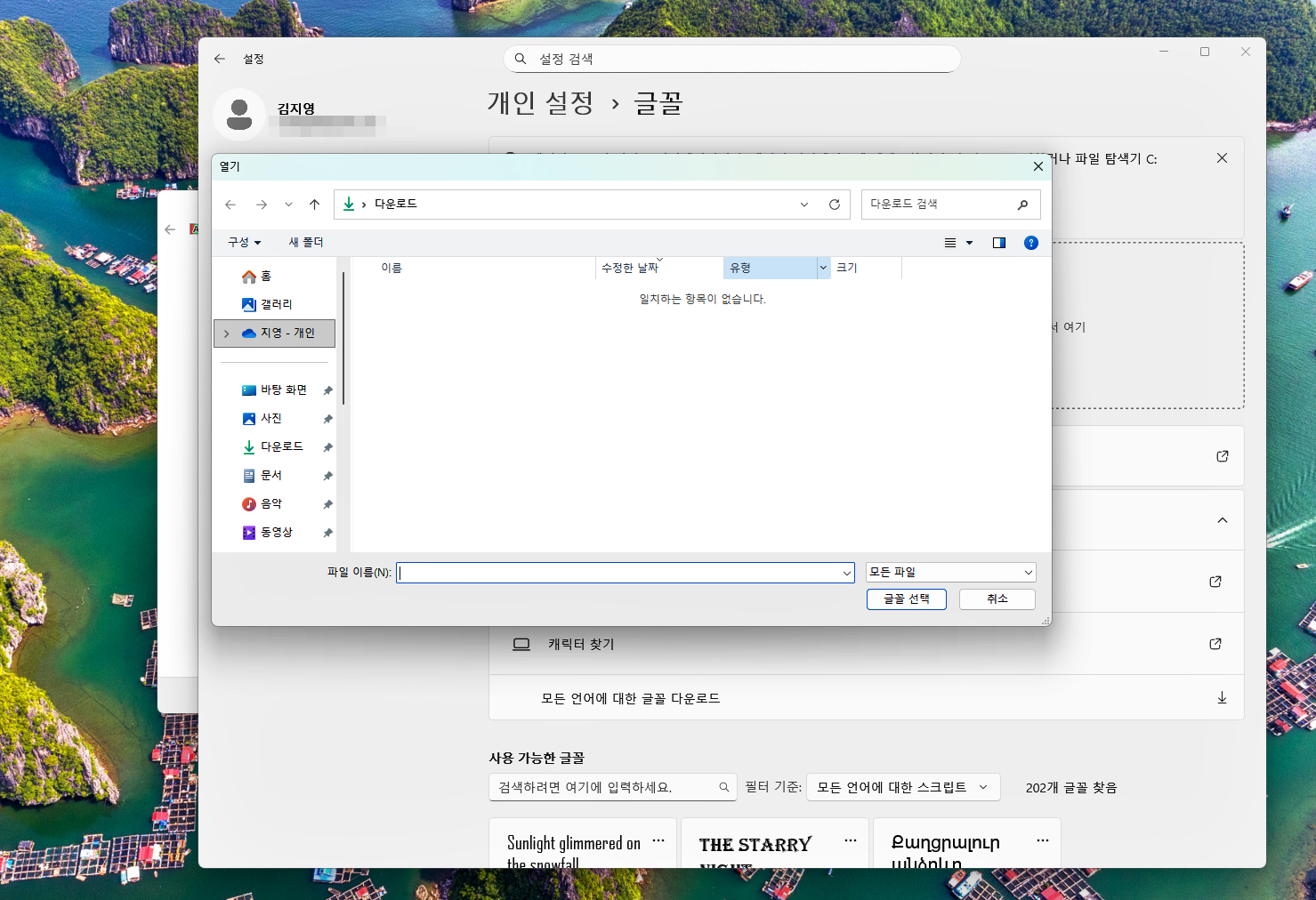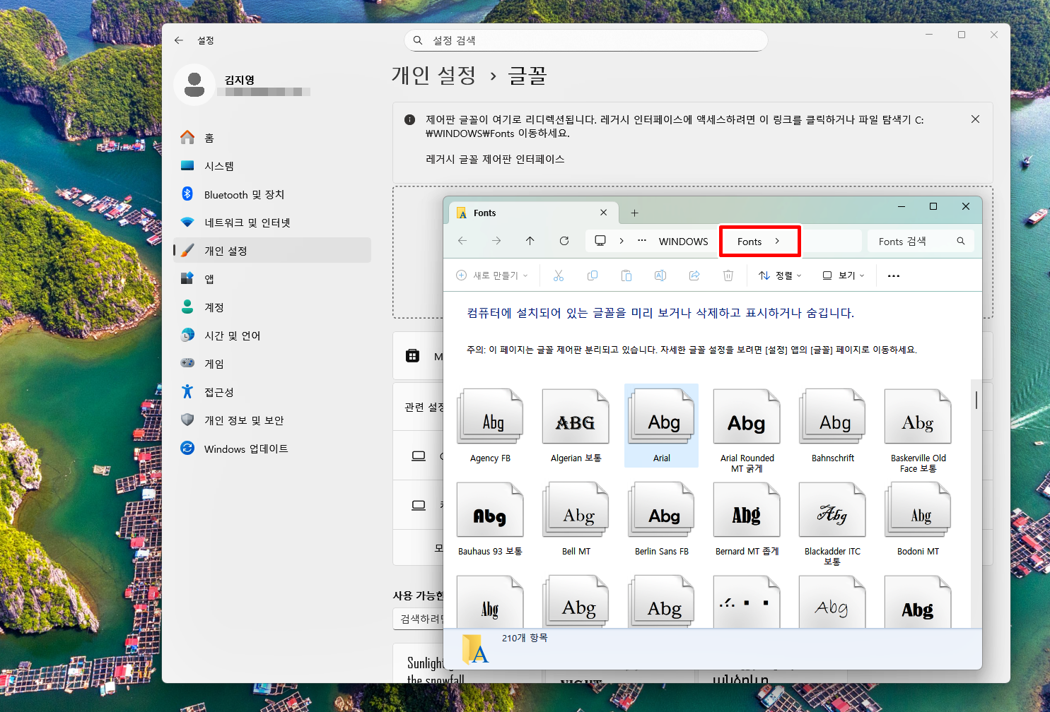 왼쪽 메뉴에서 개인 설정을 선택하고 글꼴을 찾아주면 되겠어