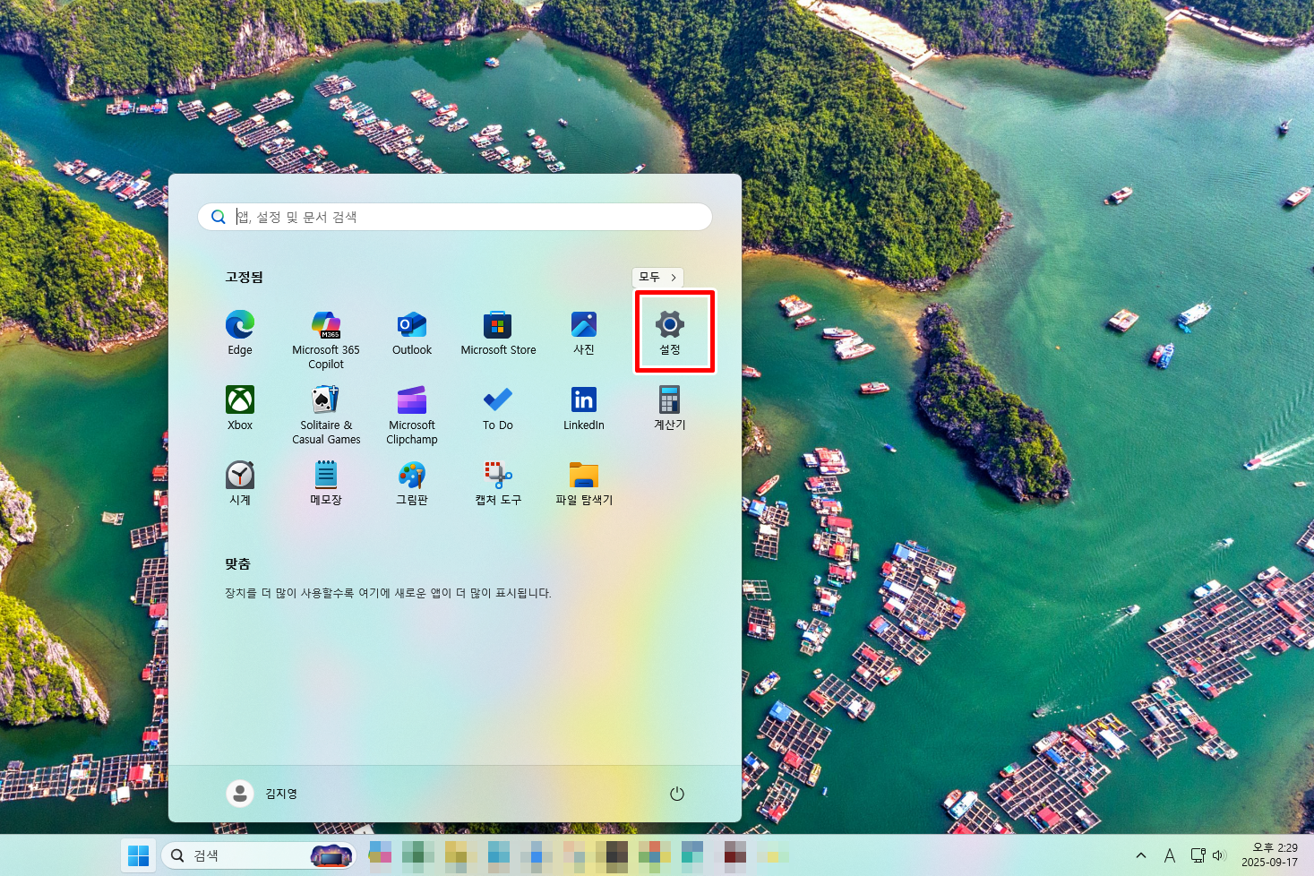 바탕화면에서 윈도우키를 누르고 설정을 선택해 줘