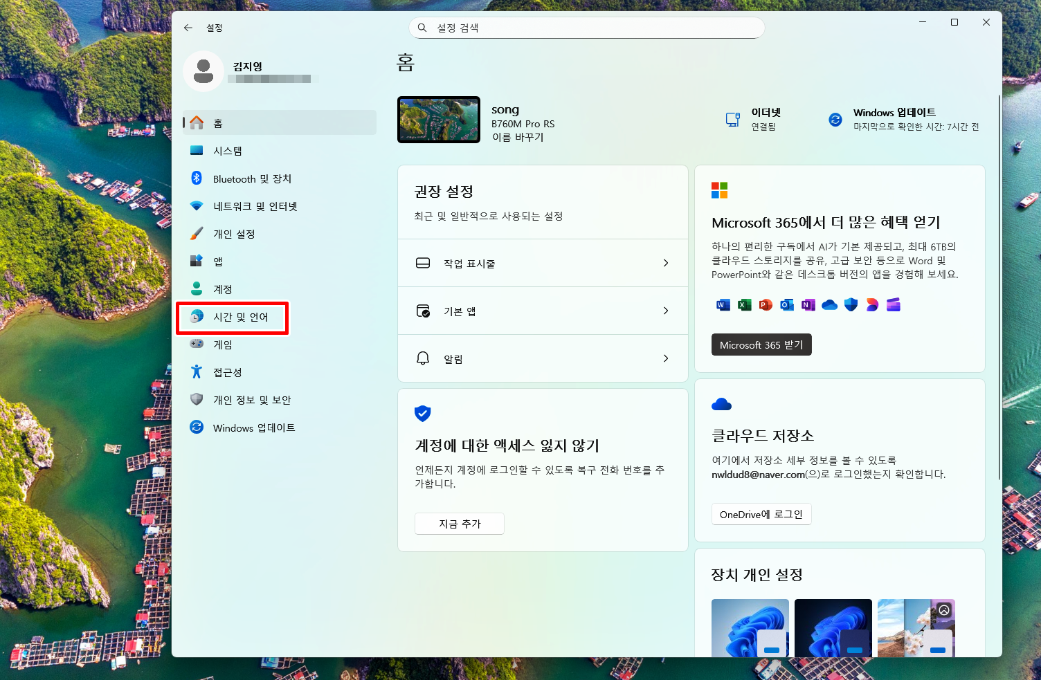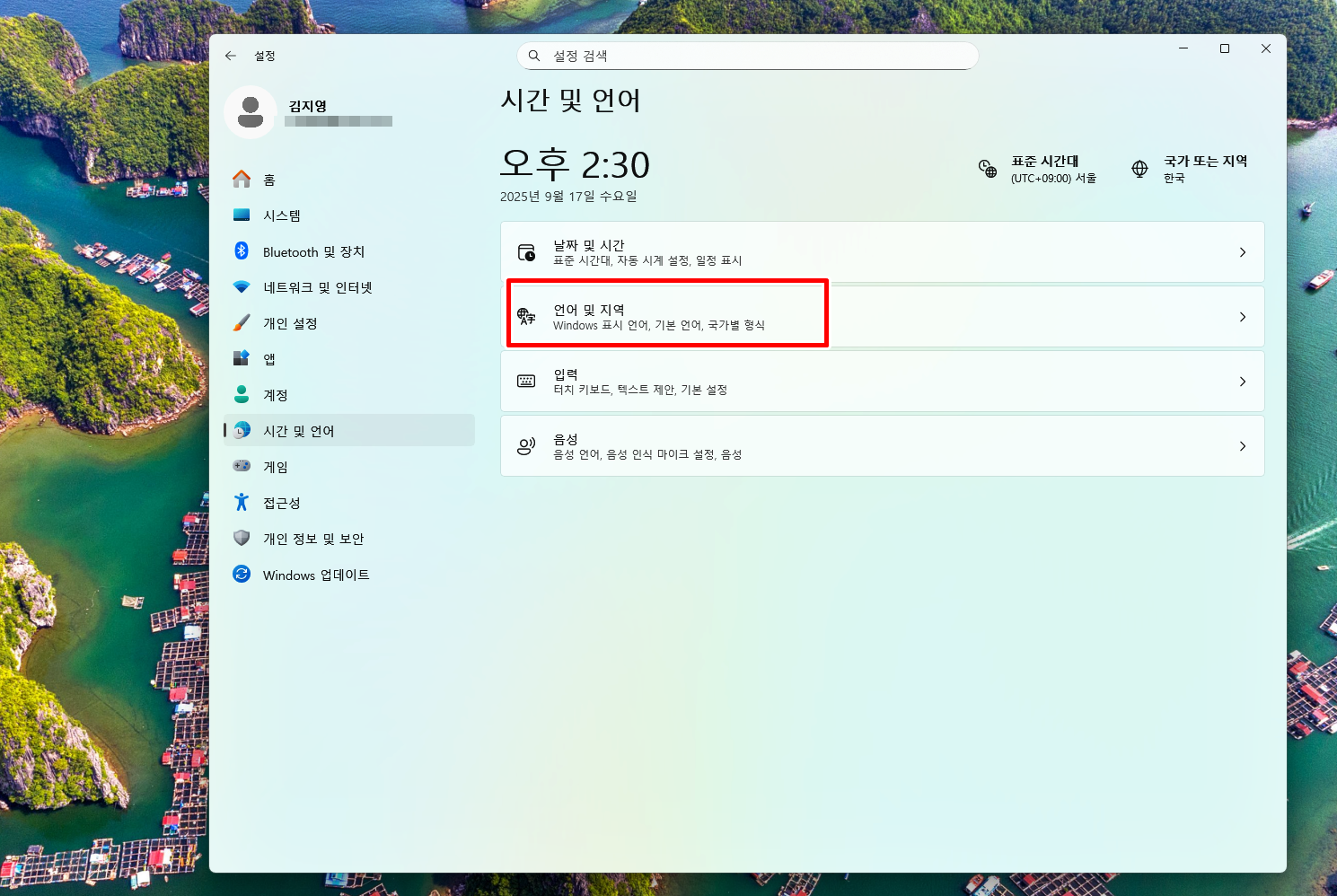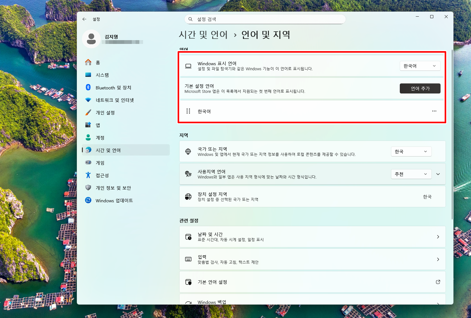왼쪽 메뉴에서 시간 및 언어를 통해 언어 및 지역을 클릭해 줘