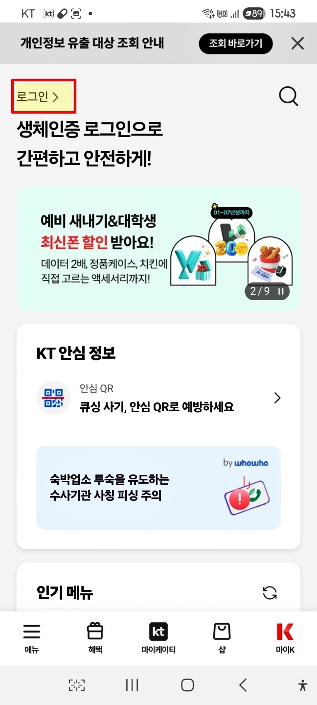 마이케이티 앱을 통해서 로그인을 진행해 줘