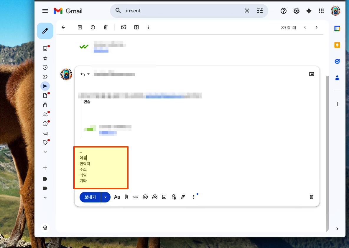 서명이 제대로 설정되었는지 확인하기 위해, 자신에게 테스트 이메일을 보내어 잘 나타나는지 확인해 줘