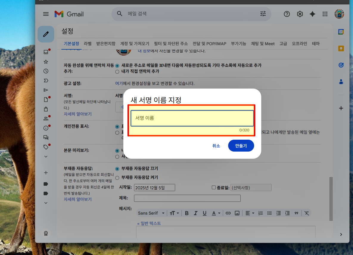 설정 페이지에서 아래로 내려가서 서명 탭을 찾아줘