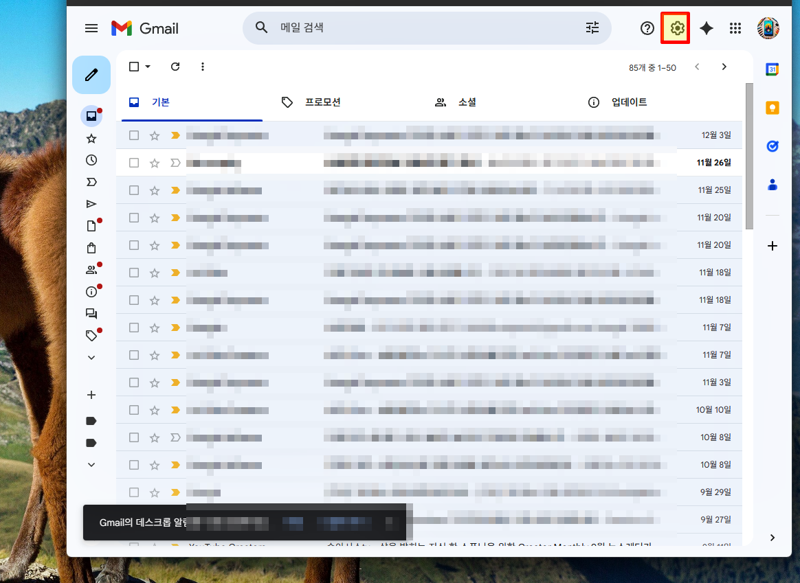 메일함에서 오른쪽 상단의 톱니바퀴를 누르고 모든 설정 보기를 선택해 줘