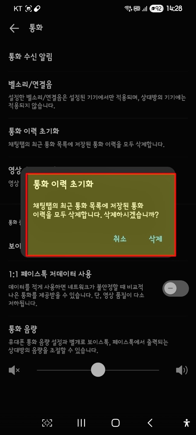 통화 메뉴에서 통화 이력 초기화를 선택한 후, 삭제 버튼을 클릭하여 이력을 삭제해 줘