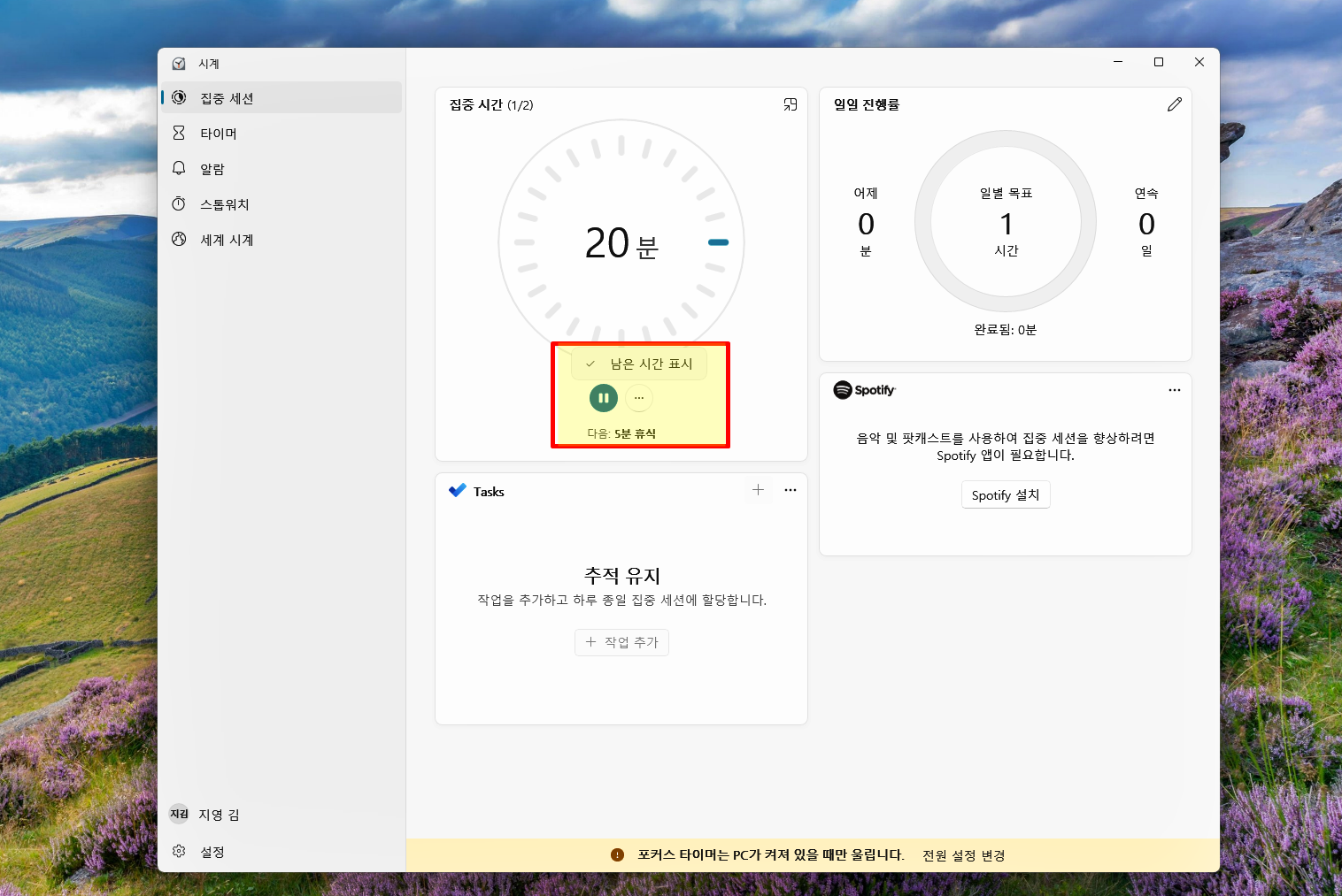 여기서 집중세션과 관련된 다양한 옵션을 설정할 수 있겠어