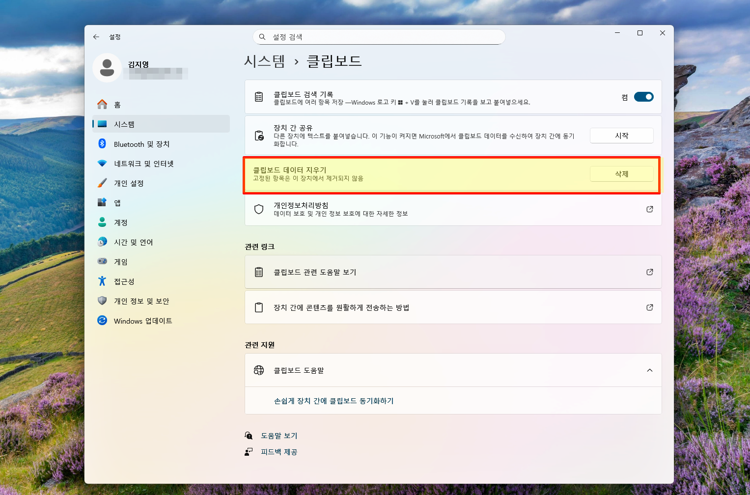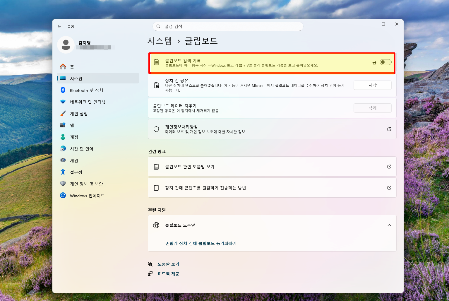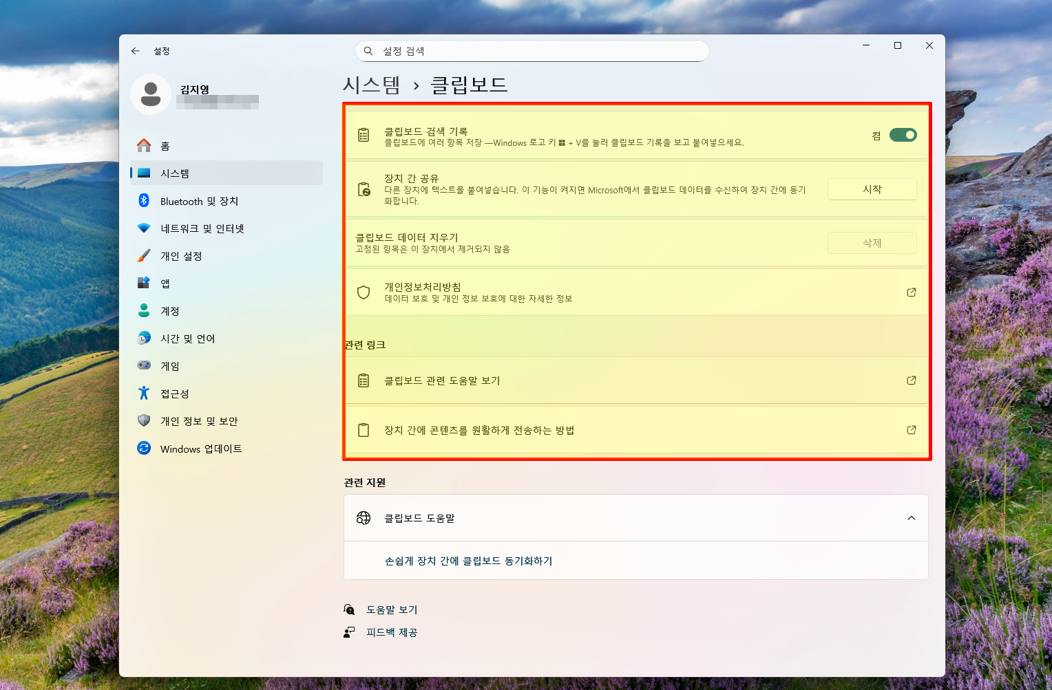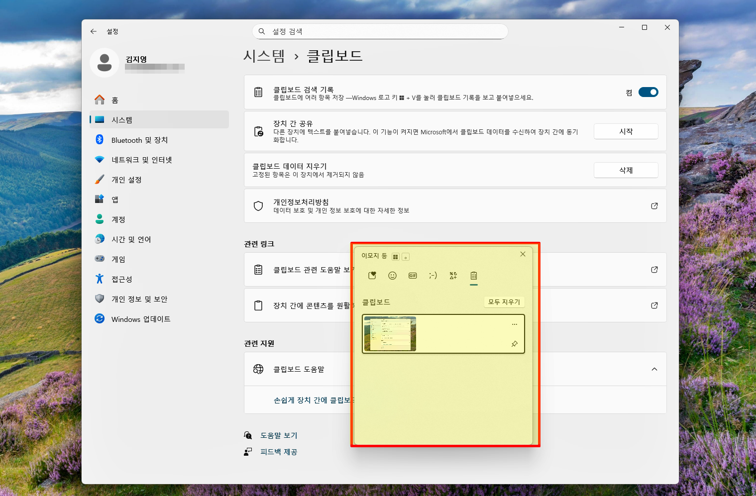 설정 항목에서 시스템을 선택하고 클립보드를 찾아줘